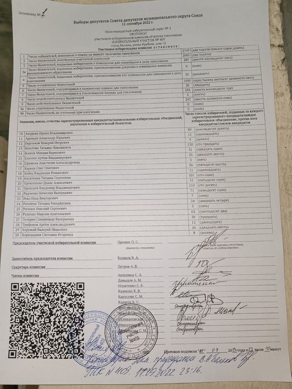 В сообщении на «Карте нарушений» указано, что ночью под руководством председателя ТИК района Сокол в Москве был полностью сфальсифицирован протокол голосования по УИК №409. Итоговые данные отличаются с заверенной копией протокола с избирательного участка, предоставленной наблюдателями.