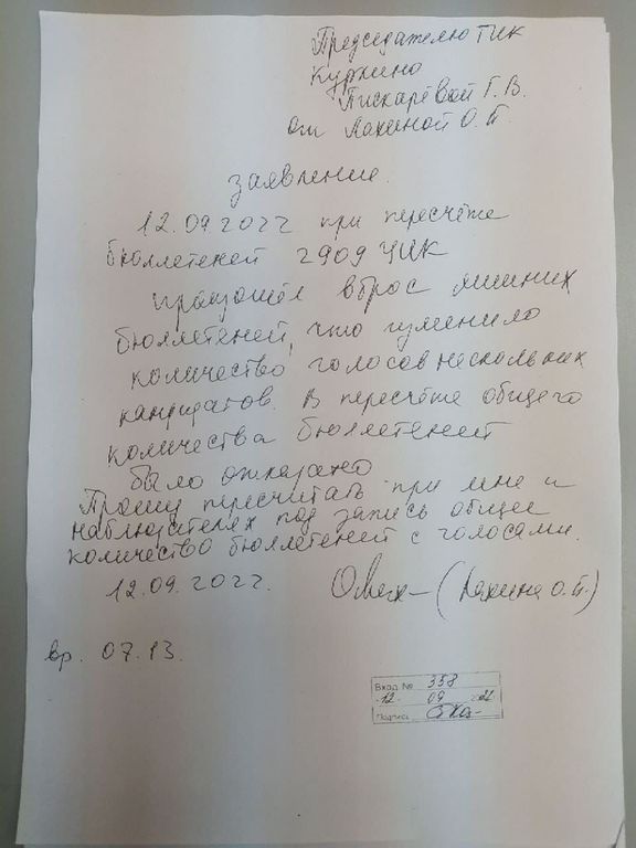 Через 20 минут после этого недостающие заявления принес полковник из ВУНЦ ВМФ «Военно-морская академия», который не представился. Наблюдатели и доверенные лица кандидатов, которые присутствовали при этом, зафиксировали факт нарушения и подали жалобу председателю комиссии.