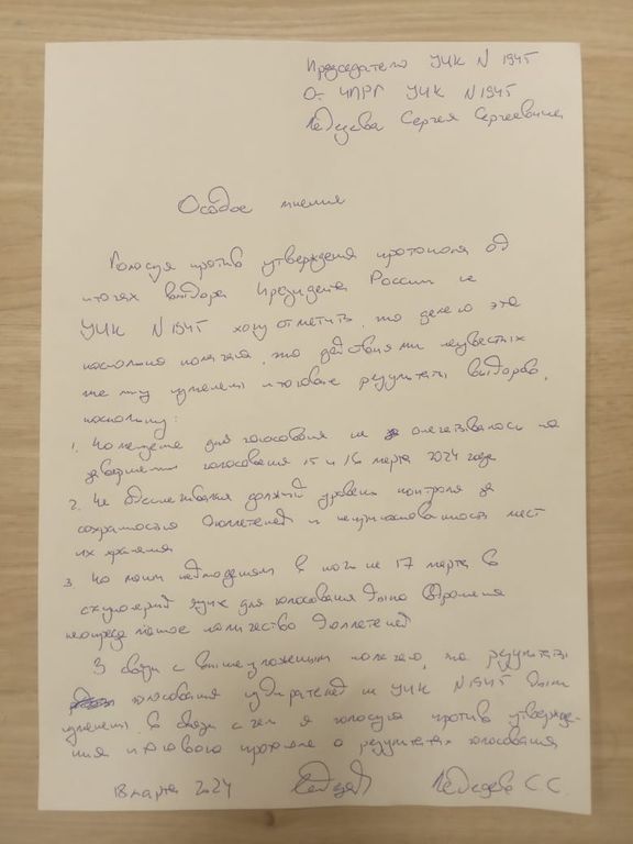 В Приморском районе Санкт-Петербурге на УИК №1945 член комиссии с правом решающего голоса подал особое мнение: он считает, что 17 марта был организован вброс бюллетеней в ящик для голосования.